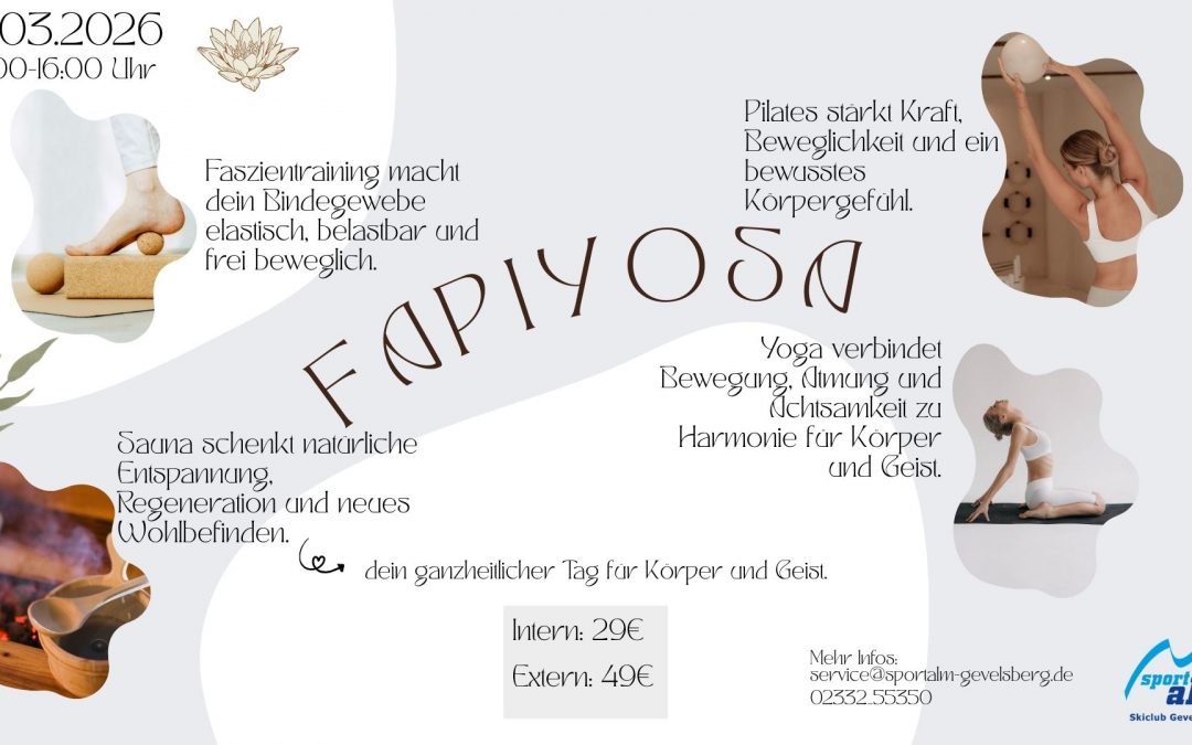 Erlebe einen besonderen Tag voller Bewegung, Entspannung und neuer Energie. Bei FAPIYOSA verbinden wir Faszienarbeit, Pilates, Yoga und pure Erholung in der Sauna, für dein ganzheitliches Wohlbefinden.